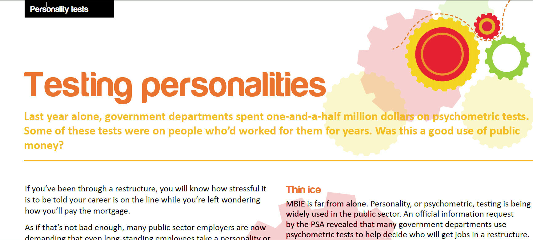 And then they go on to quote several PSA members views on testing and a summary of how much New Zealand’s Government departments have spent on testing over the last year. Overall, it’s a thorough and comprehensive a hatchet job in my opinion. Not an HR practitioner, Psychologist or counter argument anywhere in sight. Wellington’s Dominion Post has been playing along giving them substantial paper time on the subject. A selection of articles are here and here.
