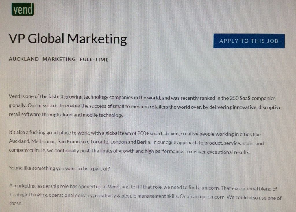 Ross spotted the advert for Vend’s VP of Global Marketing which points out what an effing great company Vend is to work for.  Ross’s view is simply that whoever wrote the job ad overstepped the mark. In his latest blog post, Ross talks about using the F word in the right context and suggests a job ad isn’t the right context. He describes it as “look-at-me showmanship” and says it’s neither clever, funny, appropriate or necessary.